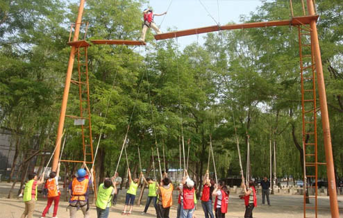 红螺湖拓展设施器材均由中国登山协会和体验式培训专家联合技术指导,参照CE标准严格生产,从天梯之间的距离、器械总体高度等方面都做了非常严密的设计,特别是从安全角度,关键零部件采用美国和加拿大进口,ACCT协会标准零部件。全部设备通过科学组合,实现了简洁、紧凑、功能强大的特点,是企业培训中心和地方拓展公司组织拓展训练时的首选设备。